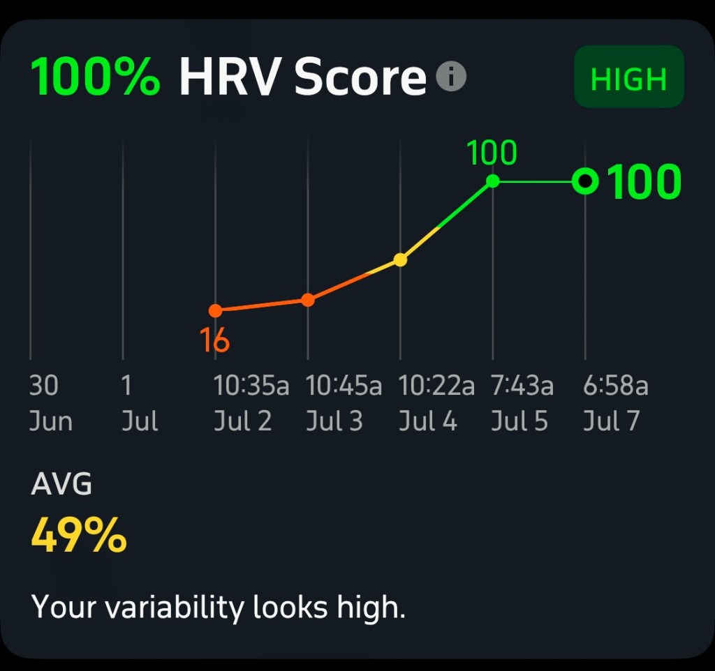Heart rate variability (HRV) is an interesting metric for me. HRV is the physiological phenomenon reflecting the variation in the time intervals between consecutive heartbeats. Compared to the heart beating at a regular rhythm, the time between beats fluctuates slightly, and HRV measures this variability. The higher the variability the better is the cardiovascular health.